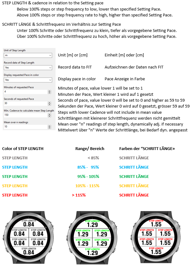 Unfortunately, without additional hardware no step length is available as a Datafield. I have programmed a Datafield which calculates the step length based on the step frequency and the speed. Furthermore, the field description "Step Length" is displayed in color, depending on the current step length and step frequency in relation to the pace given in the settings. By setting you can also activate the recording, which makes the step length available in Garmin Connect.